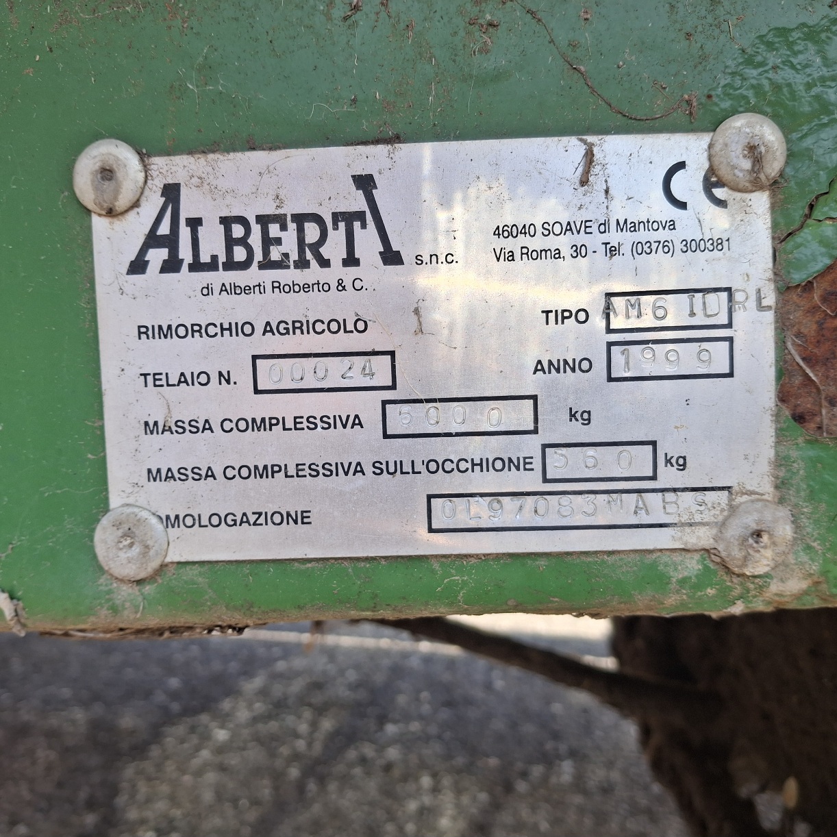 TIPOLOGIA CARRELLO MARCA ALBERTI TIPO AM6IDRL ANNO 1999 TELAIO 00024 ASSI 2 MASSA COMPLESSIVA ALL'OCCHIONE 560 KG TARGA RIMORCHIO AGRICOLO AD117B